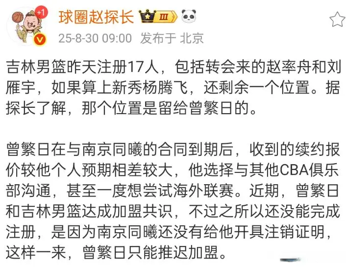 吉林男篮这个休赛期变动比较大,包括姜宇星离队,补充了赵率舟和刘雁宇,原本他们和曾繁日已经谈好了合同,但新赛季球员注册名单却没有,很多球迷都认为是曾繁日最后时刻狮子大开口,结果问题出在了老东家南京同曦。