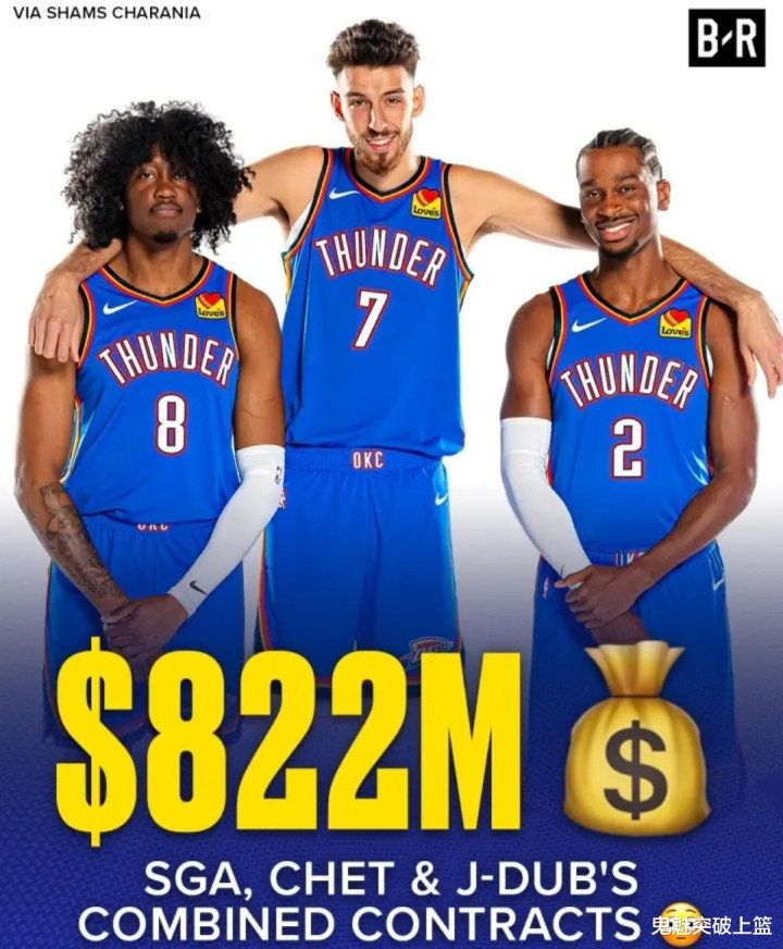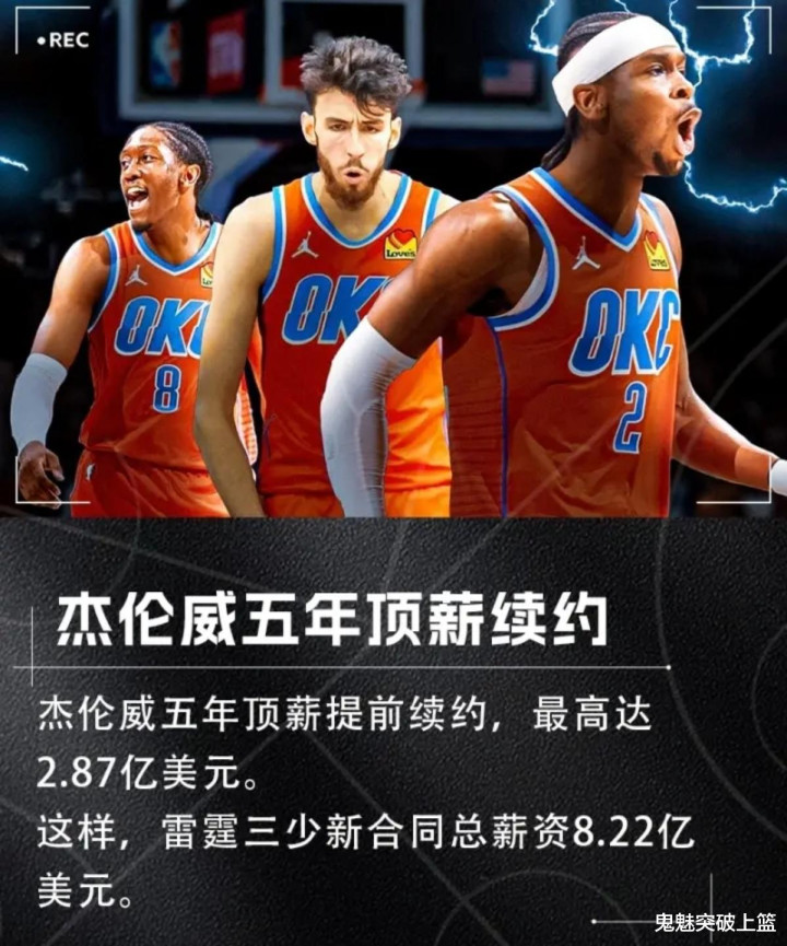 特别值得一提的是,在雷霆选择跟杰伦威廉姆斯达成5年2.87亿美元的指定新秀顶薪提前续约合同后,NBA历史最贵三巨头也就此诞生了!在提前续约杰伦威廉姆斯前,雷霆先是跟当家球星谢伊吉尔杰斯亚历山大达成一份为期四年价值2.85亿美元的超级顶薪提前续约合同,接着又跟首发中锋切特霍姆格伦签下一份为期五年最高可达2.5亿美元的指定新秀顶薪提前续约,如今又与杰伦威廉姆斯达成5年最高可达2.87亿美元的指定新秀顶薪提前续约合同。如此一来,雷霆今夏续约亚历山大、霍姆格伦、杰伦威廉姆斯三巨头的总薪资就达到了恐怖如斯的8.22亿美元。雷霆老板如此大手笔,这在联盟历史上可以说都绝对是独一档的存在。